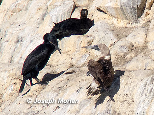 Interaction with adjacent Brandt's Cormorant. Dark bill base and white nape mark showing.