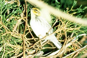 If our mystery bird is a hybrid, it must certainly be of a very rare recessive type. I sent copies of these slides to Morrison, who wrote to me that he felt this bird was not a hybrid. In my opinion, this individual has too many traits which are perfect for Black-throated Green, including the unstreaked green back, the dark line through the eye, and the hollow face patch. If this bird were a hybrid, it would certainly be a very insidious individual to look so much like Black-throated Green.